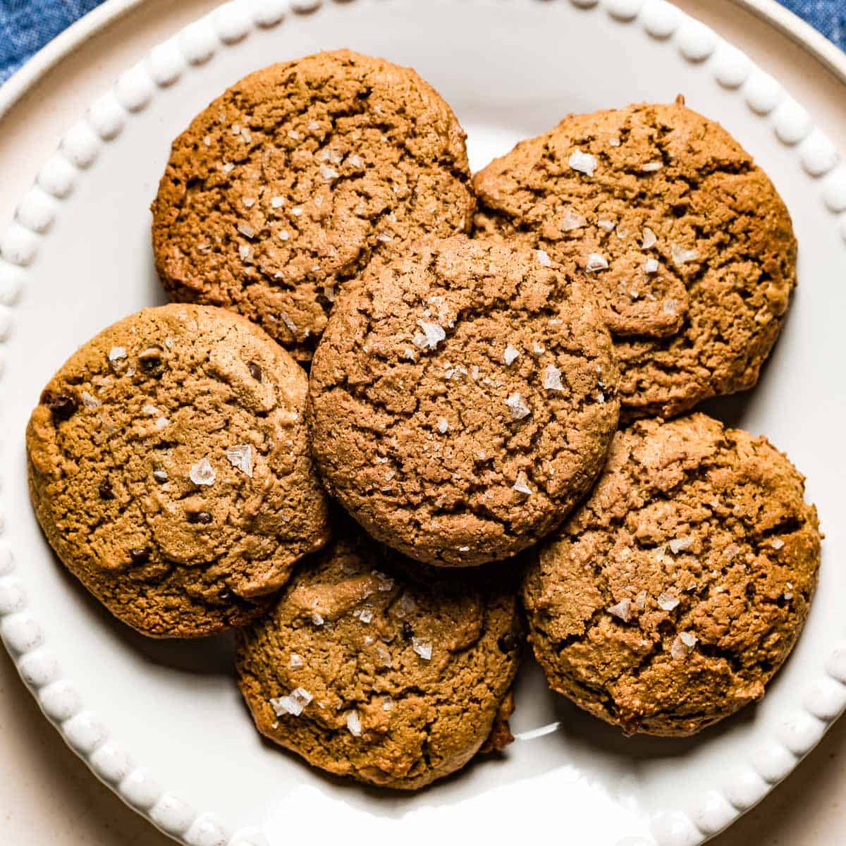 0 Preheat the oven and prepare your baking sheets: Preheat the oven to 350 F degrees. Adjust the oven racks to middle and lower-middle positions. Line two baking sheets with parchment paper. 1 Place all ingredients in the bowl of your food processor: Starting from the dry ingredients place all of the ingredients in the bowl of your food processor. 2 Pulse and process: Pulse everything 8-10 times in 1-second increments just until all ingredients are fully mixed (as shown in the picture above.) You do not want to let it run for a long time. Since the dough is very sticky if you run it nonstop it could clog your food processor. It is also a good idea to stop and scrape the sides of the bowl a few times as you pulse. 3 Add in the chocolate chips, if using: If you are adding the chocolate chips, transfer the dough into a bowl and mix in the chocolate chips. If you are not adding them in, you can start scooping right off the bowl of your food processor. 4 Scoop and transfer cookies onto the prepared baking sheets: Using a cookie scoop or two spoons, measure 2-tablespoon balls and place them 2-inches apart from one another on the prepared baking sheets. As I mentioned earlier, this is a very sticky batter. If you don’t mind the stickiness you can roll them in between your palms but it would also be fine if you didn’t. Continue with the rest of the cookie dough and evenly distribute them amongst two baking sheets. 5 Sea salt on top: As a final touch, sprinkle each cookie with a pinch of (about 1/16 of a teaspoon) sea salt. 6 Bake: Bake in the preheated oven for 13 minutes or until they spread slightly and turn golden brown making sure to rotate and swap the sheet pans mid-way through. 7 Let them cool and enjoy: Let cool for 3 minutes in the sheet pan and then transfer onto a wire rack to cool completely. Serve.View original recipe