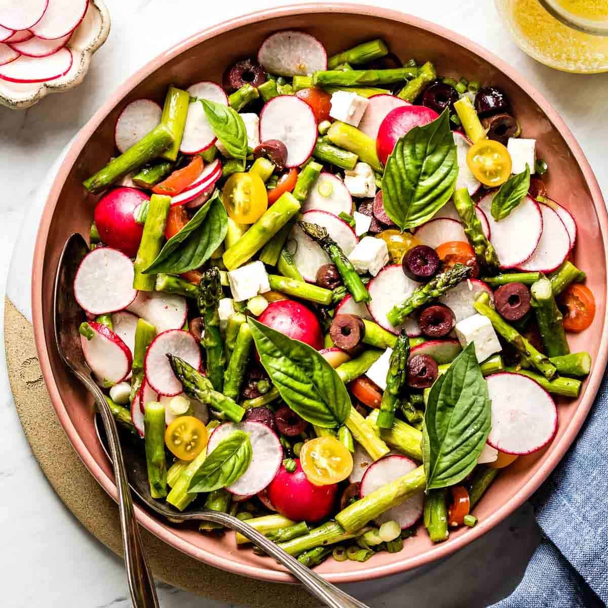 0 Preheat the oven to 425 degrees F. Place asparagus on a sheet pan in one layer. Drizzle with oil and sprinkle with salt and pepper. Give it a toss, making sure that all the spears are coated with the oil and seasoning. 1 Roast for 12 minutes or until the asparagus is cooked*. Transfer onto a plate and let asparagus cool. When cooled, cut the asparagus into 2-inch pieces. Place into a salad bowl. 2 While the asparagus is roasting make the lemon vinaigrette by mixing together 1/4 cup olive oil, 3 tablespoons of lemon juice, 1 clove of minced garlic, 1/2 teaspoon of dijon mustard, 1 teaspoon of kosher salt, and 1/2 teaspoon of black pepper. 3 To assemble the asparagus salad: Place tomatoes, radishes, scallions, olive into the bowl with the asparagus. Drizzle with the dressing. 4 Stir in the feta cheese (if using) and basil leaves. Give it a gentle toss. Serve.View original recipe