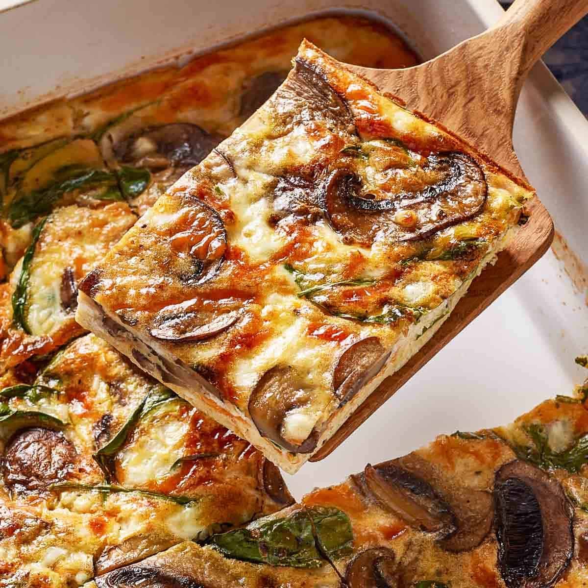 0 Preheat the oven to 375 °F (191°C). Lightly grease a 9X11 (or 9 X13 casserole dish). Set it aside. 1 Heat butter in a 10-inch nonstick skillet over medium heat. Add the sliced mushrooms and cook until softened, 3-4 minutes, stirring occasionally. Season with salt and set it aside to cool. 2 In a large bowl, whisk eggs until well beaten. 3 Mix in the cottage cheese, cheddar cheese, garlic powder, paprika, and black pepper. 4 Fold in the now-cooled mushrooms and baby spinach. 5 Pour the mixture into the prepared casserole dish. 6 Bake for 35-40 minutes or until the middle of the egg bake is set (no longer jiggly). 7 Let it cool for 10 minutes. Slice and serve.View original recipe