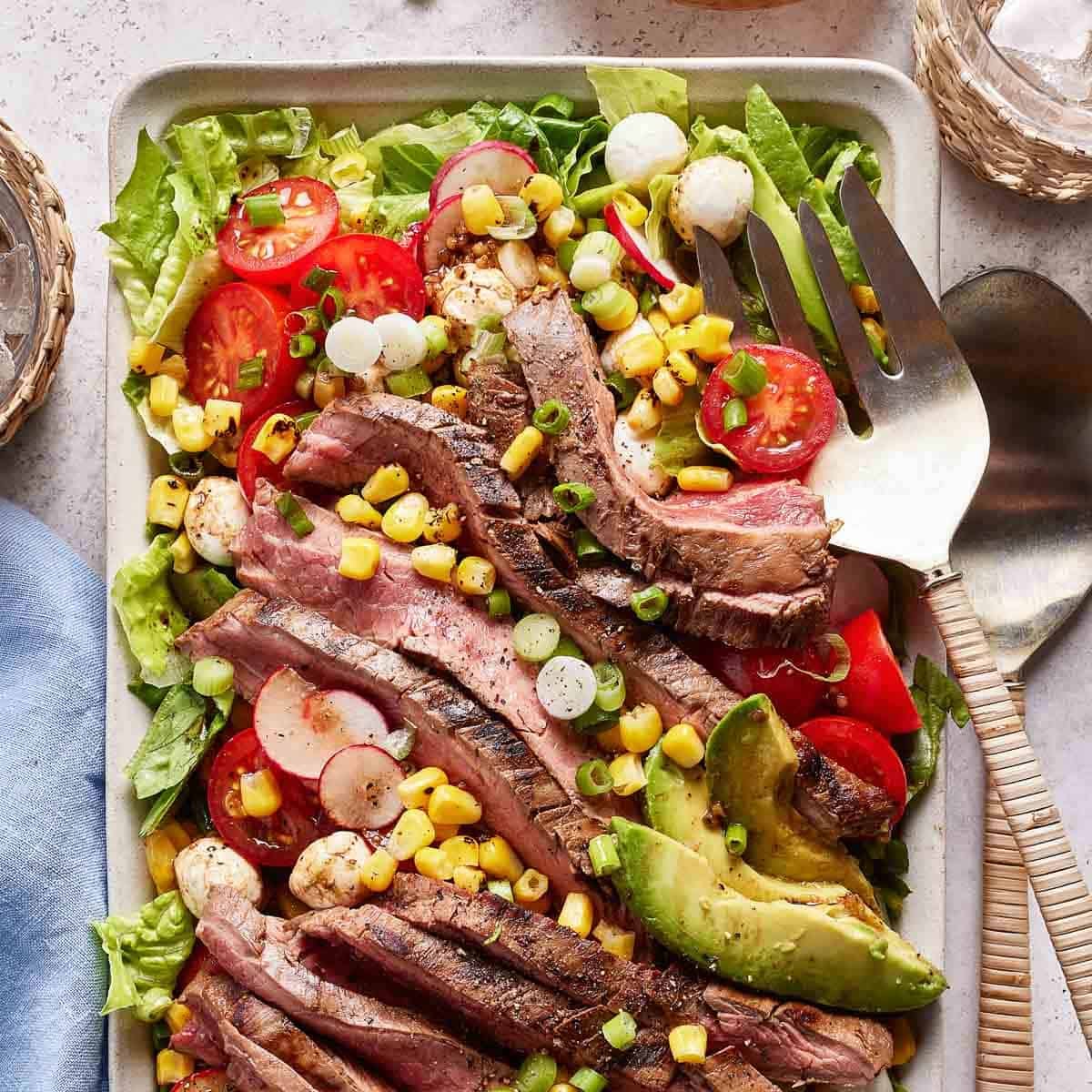 This grilled flank steak salad is packed with tender marinated steak, crisp romaine, sweet grilled corn, creamy avocado, and fresh mozzarella. Tossed in a tangy balsamic dressing, it's a fresh, meal-worthy summer salad perfect for weeknights or backyard gatherings.