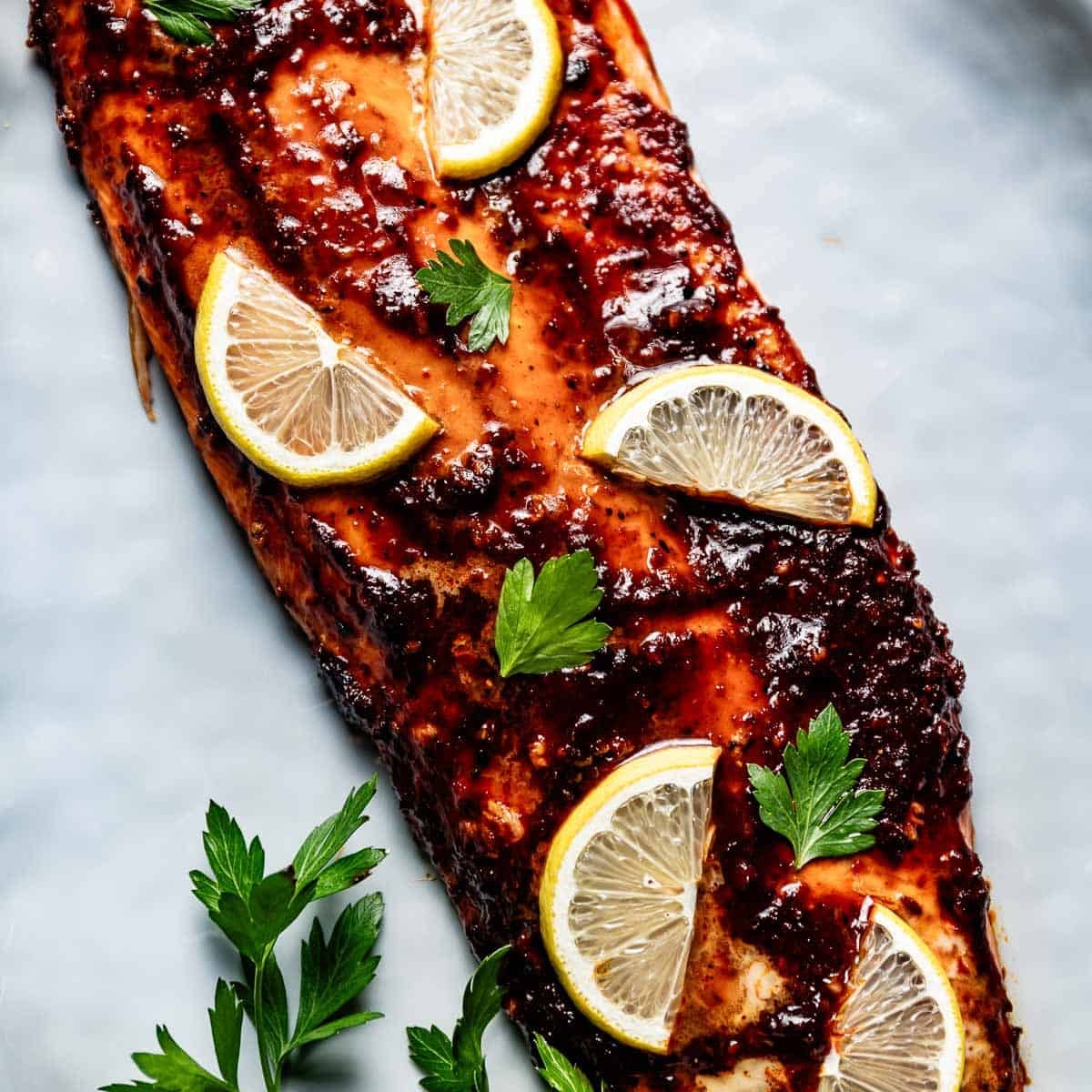 This baked harissa salmon recipe is spread with a sweet and spicy honey-harissa glaze for a quick and easy dinner you can make in under 30 minutes.