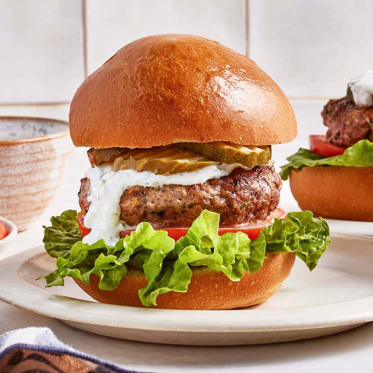 0 Place 1lb ground lamb, 2 cloves of minced garlic, 2 tablespoons of fresh parsley, 2 tablespoons of fresh mint, 1 teaspoon of ground cumin, 1 teaspoon of ground coriander, ½ teaspoon of paprika, 1 teaspoon of kosher salt, and ½ teaspoon of ground black pepper in a large bowl. 1 Using clean hands, mix until all the ingredients are fully combined, being careful not to overwork the meat. 2 Divide the meat mixture into four equal portions and shape them into 4-inch-wide patties. As you shape them, remember that they shrink slightly during the cooking process so it is best to make them a bit larger than your burger bun. 3 Use your thumb to gently press a shallow indent in the center of each patty—this helps them cook evenly and prevents puffing on the grill. Cover and set aside while you preheat the grill. To Cook On the Grill: 4 Preheat a gas grill to medium-high heat (around 400–425°F). Once hot, scrape the grates clean and brush them with olive oil. 5 Place the lamb patties on the grill and cook for 3–4 minutes per side for medium (145°F) or 5–6 minutes for well done (160°F), depending on your preference. Once cooked, place them on a plate, cover with aluminum foil and let them rest for 2-3 minutes for the juices to redistribute. To Cook in the Oven: 6 Preheat your oven to 400°F (200°C). Line a baking sheet with parchment paper. 7 Transfer the patties to the baking sheet and bake for 15–18 minutes, flipping them halfway through. To Cook on the Stove: 8 Heat a tablespoon of oil in a cast-iron, grill pan, or non-stick skillet over medium heat. 9 Place the lamb patties on the hot skillet and cook for 5–6 minutes (or more, depending on your doneness preference) per side. 10 While the patties are cooking, place the buns on the cooler side of the grill (or in the oven or the skillet) to warm them through. To Assemble 11 To make lamb burgers, spread some tzatziki (or yogurt dill sauce) on the bottom half of each bun. Add a slice of tomato, some salad greens, a few pickle slices, and a grilled lamb patty. Spoon a little more tzatziki over the top of the meat, then place the top bun on and serve.View original recipe