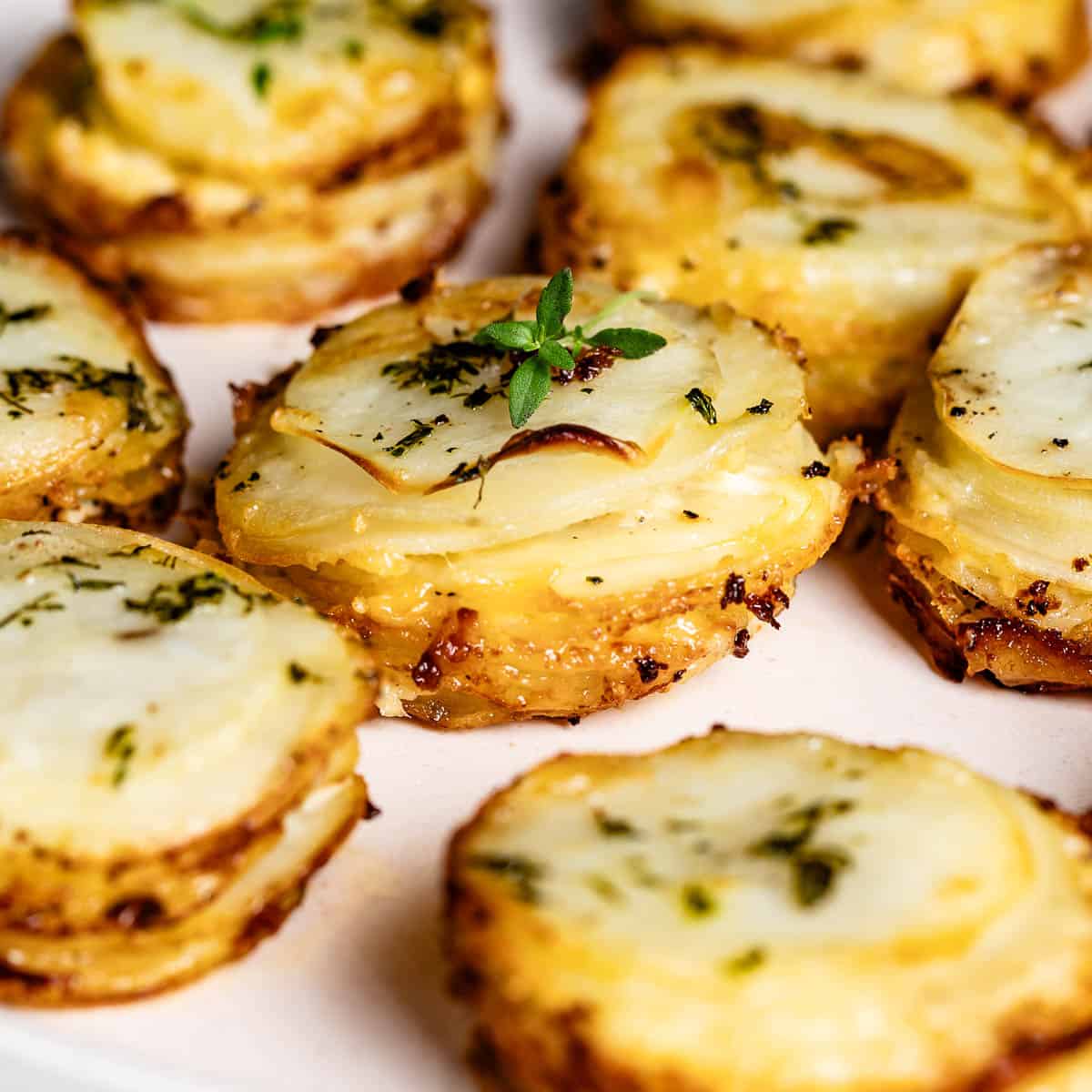 Muffin Tin Potatoes is the easiest yet most delicious appetizer or side dish. Stacked potato slices layered with garlic, parmesan cheese, and fresh thyme baked in a muffin cup to perfection.
