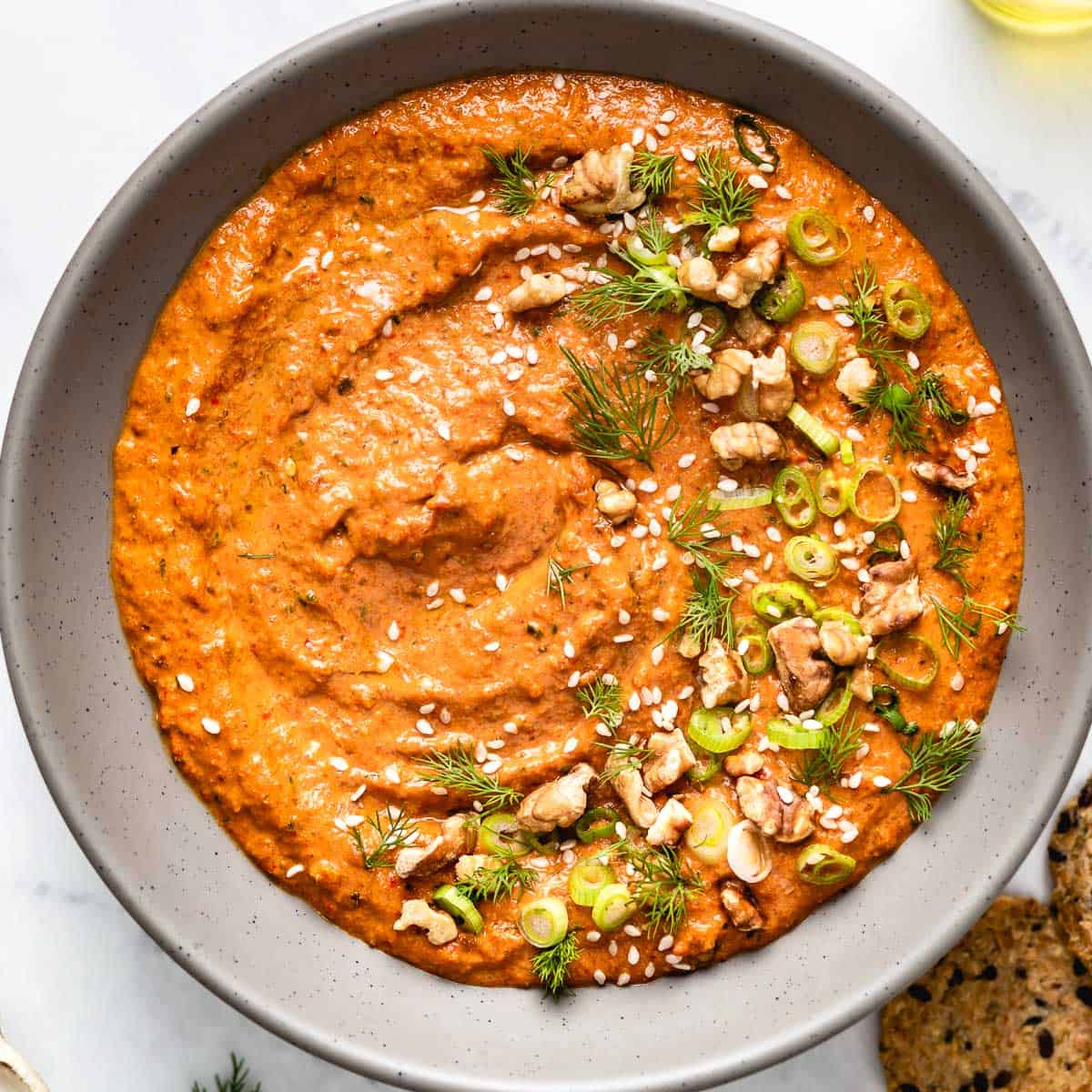 Muhammara is a traditional Syrian red pepper dip made with roasted red peppers, walnuts, and pomegranate molasses. This recipe is easy to make, vegan and gluten-free. Serve as a dip, spread, or even as a pasta sauce. It is deliciously addictive!