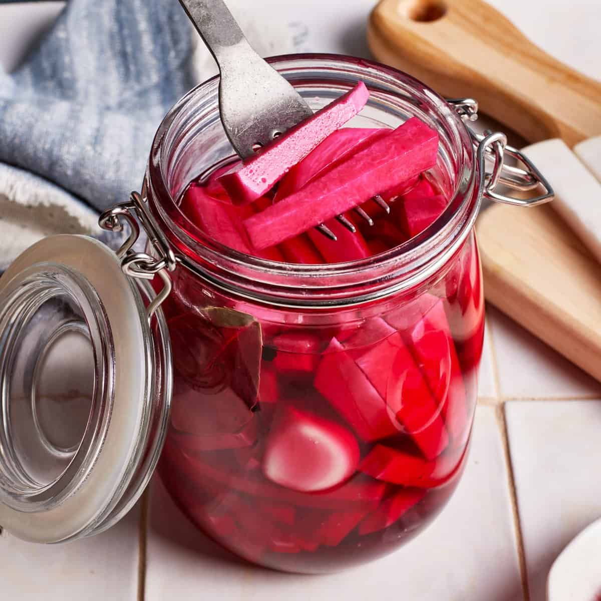 0 Add 1 cup of hot water, 1 cup of white distilled vinegar, 1 tablespoon sugar, and 2 tablespoons of kosher salt in a large measuring cup. Stir until the sugar is fully dissolved.* 1 In the mason jar, layer the turnips, beets, and garlic evenly: start with a handful of turnips, then a few pieces of beet, followed by a piece of garlic. 2 Repeat the same pattern until the jar is filled, ensuring the ingredients are distributed evenly throughout the jar. Gently push down to ensure they fit into the jar. 3 Add the bay leaf and peppercorns. 4 Pour the prepared vinegar mixture over the vegetables, ensuring everything is submerged but there is still an inch of space left on top. 5 Seal the jar tightly and let it cool to room temperature before storing it in the refrigerator. 6 Refrigerate for at least 3 days before serving to allow the flavors to meld. For best results, wait 5-7 days.View original recipe