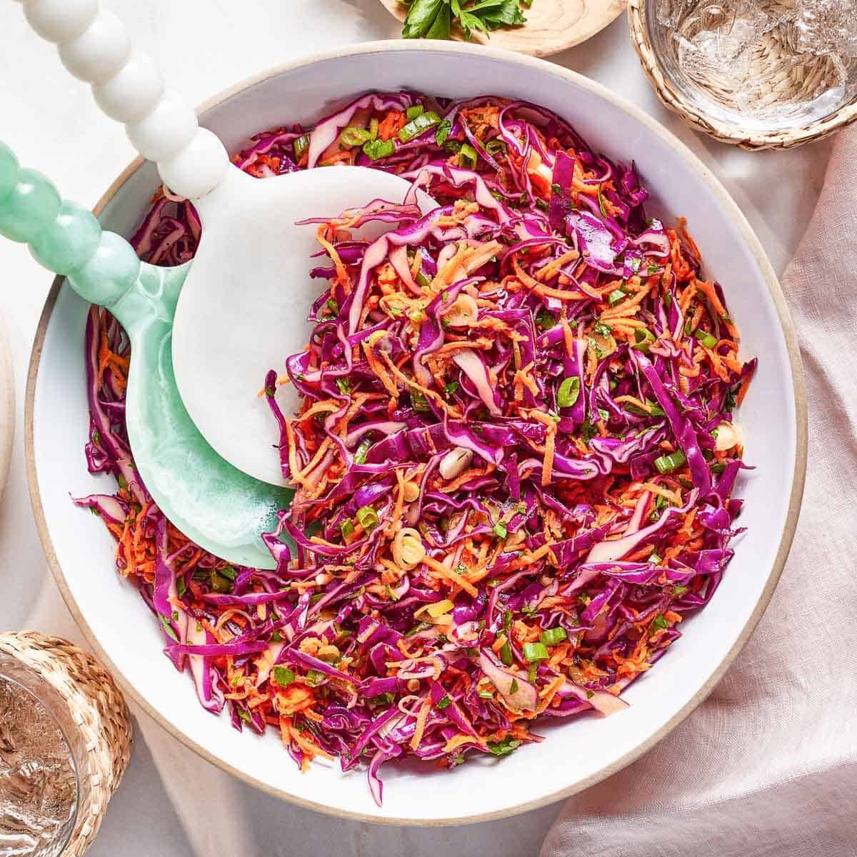 A vibrant and easy Red Cabbage Slaw made with a light, zesty dressing — no mayo needed! Great for tacos, pulled pork, grilled meats, and fresh summer meals. Vegan and gluten-free.