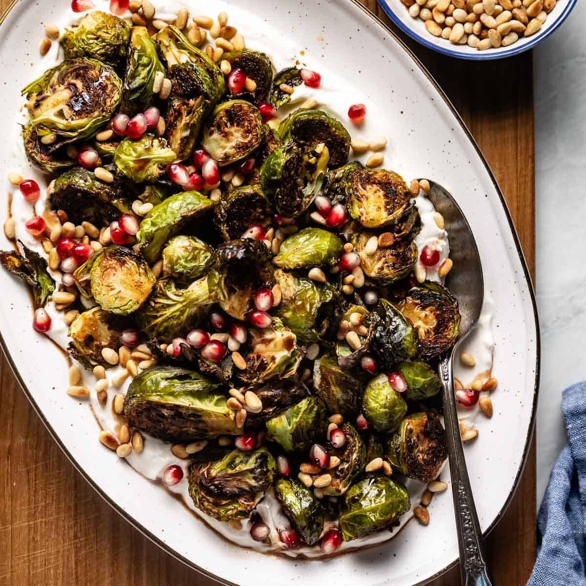 These roasted Brussels sprouts are crispy on the outside, tender on the inside, and served over a creamy tahini yogurt sauce for a bright Mediterranean twist. Finished with toasted pine nuts, pomegranate seeds, and a drizzle of pomegranate molasses, this simple side dish feels restaurant-worthy yet easy enough for any weeknight or your holiday table.