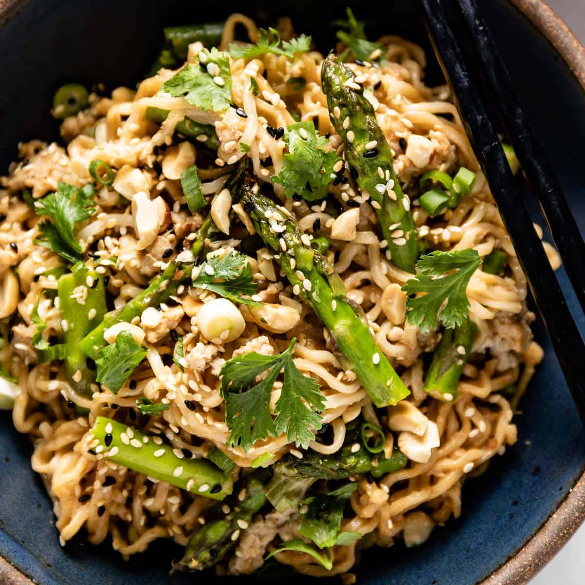 0 To cook the chicken: Heat sesame oil in a large skillet over medium heat. Add in the ground chicken and cook, breaking the large pieces with a wooden spoon, for 7-8 minutes or until no longer pink. 1 Add in the asparagus and let it cook, stirring occasionally, until vegetables are crisp-tender, 4-5 minutes. 2 Toast the sesame seeds: Place sesame seeds in a small empty skillet over medium heat. Toast, stirring frequently, for 4-5 minutes or until they turn golden brown. Do not leave the site of it as they can burn easily. 3 Cook the ramen noodles: Meanwhile to cook the ramen noodles, fill a medium-sized saucepan with water and a tablespoon of salt. Bring to a boil. Add the noodles and cook for 2 minutes. Save ¼ cup of the pasta water and drain the rest. 4 Make the noodle sauce: While the chicken is cooking, make the peanut butter sauce. To do so, whisk together peanut butter, garlic, ginger, soy sauce, rice vinegar, brown sugar, lime juice, and Sriracha ( if using) in a measuring cup. 5 Assemble: Right before serving, place the ramen noodles into the skillet with chicken and asparagus. Drizzle it with the peanut butter sauce and add in the chopped scallions. Using kitchen tongs, give it a toss making sure that the noodles are evenly coated with the sauce. If it gets too sticky, drizzle it with the reserved pasta water as you toss. 6 Divide the noodles into bowls and garnish with chopped peanuts, sesame seeds, wedges of lime, and chopped fresh cilantro, if using.View original recipe