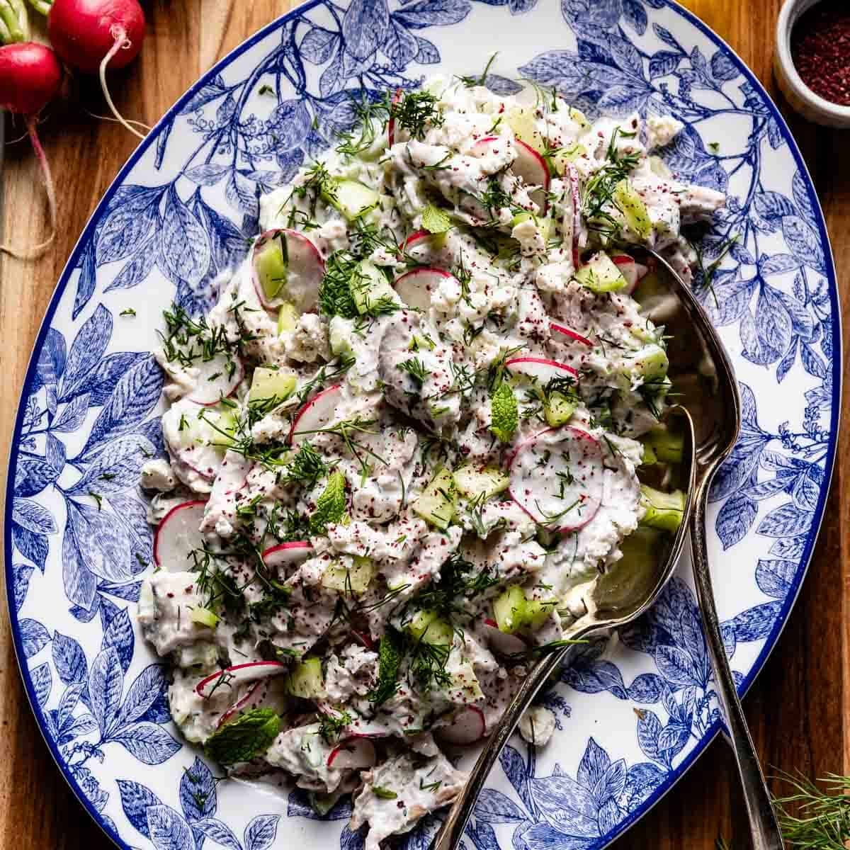 0 To make the tzatziki, start by placing a colander in a bowl. Shred cucumbers using a box grater and place them in the colander. Using the back of spatula (or spoon), press out as much of the liquid as possible. 1 Transfer the shredded cucumbers to a large bowl, then add Greek yogurt, lemon juice, minced garlic, kosher salt, black pepper, and fresh dill. Stir well to combine. Taste for seasoning, and add more salt, pepper, or lemon juice as needed. 2 To make the salad, add cooked chicken, diced cucumbers, sliced radishes, and chopped green onions. 3 Gently fold the ingredients, ensuring that all the chicken salad ingredients are evenly coated with tzatziki. 4 Garnish with crumbled feta cheese, sumac, and fresh herbs, if using.View original recipe